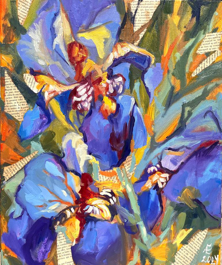 Delicate blue-lilac irises bloom gracefully, their petals unfurling like soft whispers in the breeze. Light dances across their textured surfaces, revealing subtle shades of lavender and sky. The painting captures both fragility and elegance, inviting the viewer to linger in the gentle beauty of nat...