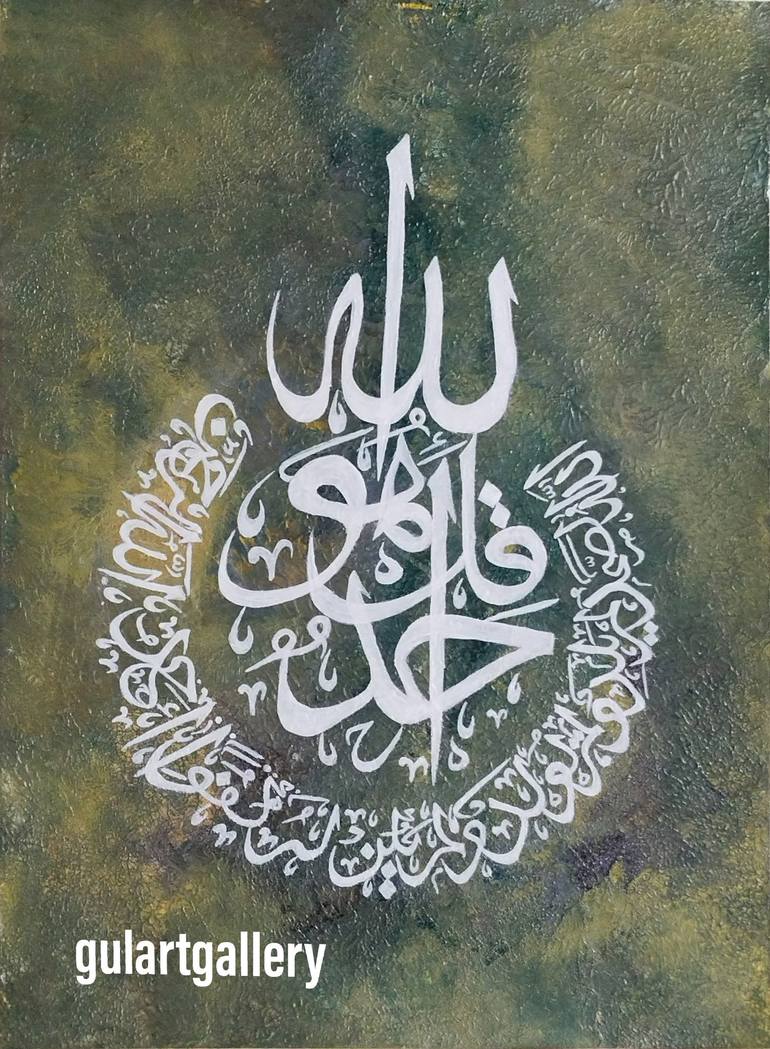 Islamic calligraphy written surah ikhlas.This painting is done in the layers of acrylic paints using different shades with the help of different brushes.