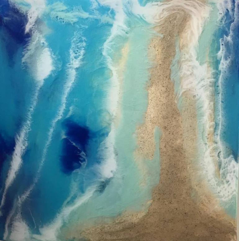 This resin, acrylic, ink, sand painting is part of the Island Arrival Series. The water is a constant source of inspiration for me. I love flying over water; seeing the translucency and change of colour with the various depths. Fluidity and depth are shown in a watery palette. In these aerial perspe...