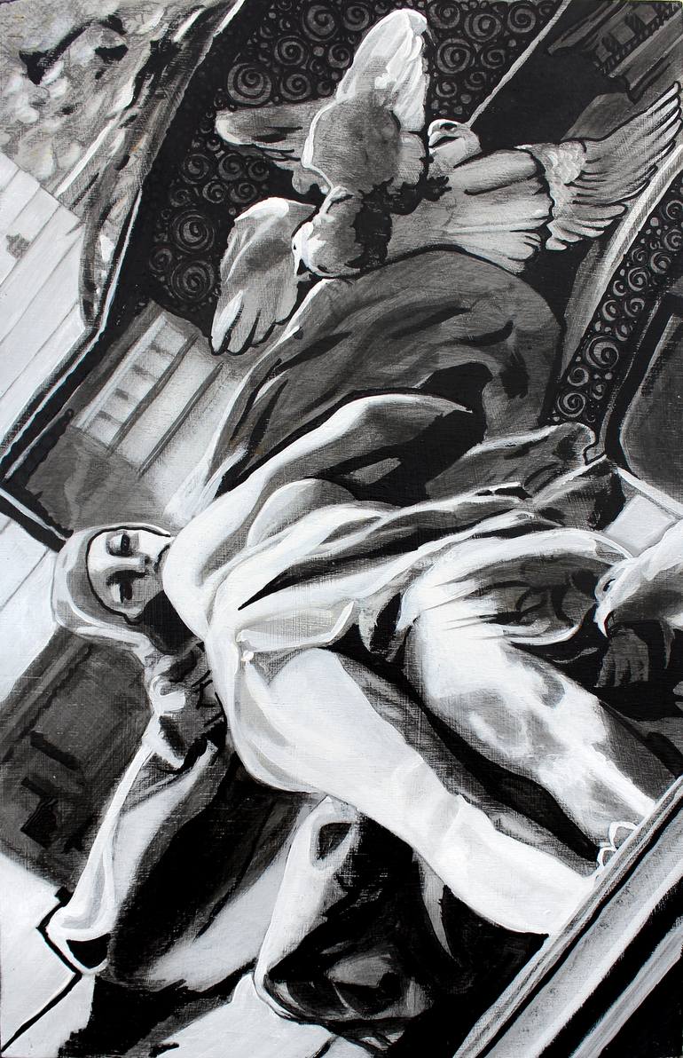 When painting, headdresses and crowns deify Kate Kelton’s subjects. She uplifts the Unsung Sheroes & Heroes, Patriarchy Smashers, Warrior Survivors, Silence Breakers, Philosophers, Truth-Tellers, Whistle Blowers and Thought Giants of all stripes. She paints her portraits cloaked in the garb of statues Ladislav Šaloun sculpted onto the train station that her great-grandfather, Josef Fanta, designed for Prague in 1901 - 1909. Apotheosis through a reclaimed, reapplied Art Nouveau. Sampling her own lineage, she transforms a historical body of work, itself a thing of lasting beauty; exchanging granite for graphite, plaster for paint. In Photoshop, she first combines the desaturated faces she's found, sourced or shot of her chosen subjects, with the black and white photos from her family and friends, of the statues in situ. Then she uses graphite, inks and acrylic paints and glazes to create the works on panel or canvas, literally uplifting and elevating her battle-weary subjects to the highest reach of architectural strata. 'Ancient and distant godlike beings, surveying a dying empire, trade places with the fresh blood of her subjects. The work presents a tactility against the digitized space, and represents a taking, an acquisition of power back from the tastemakers. Here, the mantle of the artist is above brand influencer, above internet commentator, above mere marketability. In their gaze is a warning, “Art is immortal. Come for me, why don’t you?”' ~ Micah Chaim Thomas "Kate's recent work is a matter of expansion through contrast - she is as ephemeral as her subjects are concrete architecture; she is structural when her subjects should slip through your fingers like too-fine sand. Taken as a whole, the works in her magnificent series Sentry are incredibly intelligent, but when looked at individually, you come to understand that these are statements of life beyond themselves. The series take embellishments of a Prague train station designed by her great-grandfather, Josef Fanta, and combines these with portraits of women who have stood against the sexual harassment and assault rampant in Hollywood. These women, like Kate herself, have suffered in the era where powerful men, every bit as immovable as the train station, wielded their power without check. The portraits emblazoned on architectural elements, they are marked against the edifice, every bit as permanent, and perhaps even more defining.