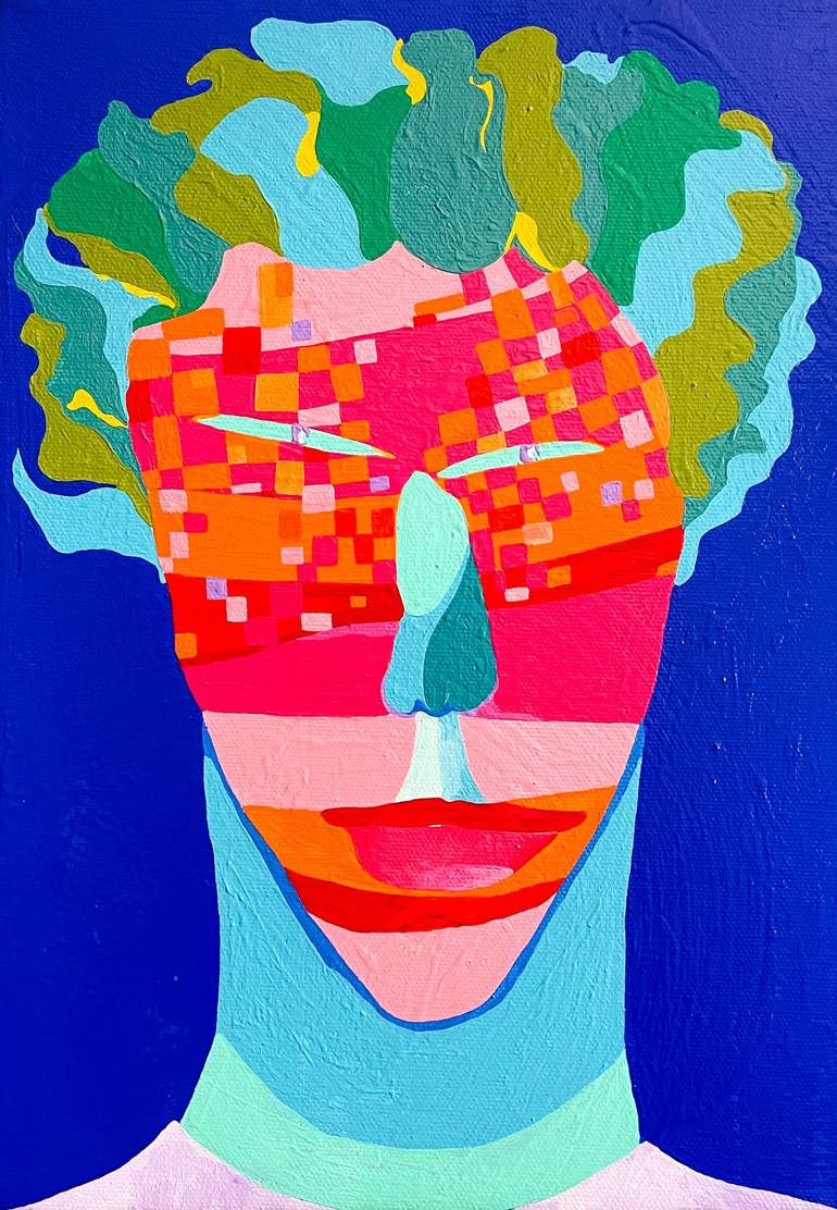 The artwork titled “It’s my day job” is a captivating abstract portrait that defies convention. Let’s delve into its vibrant details: Eyes of Mystery: The figure gazes at us with eyes that defy the ordinary. Instead of traditional eyes, we see a pattern of red and pink squares—a cryptic code hintin...