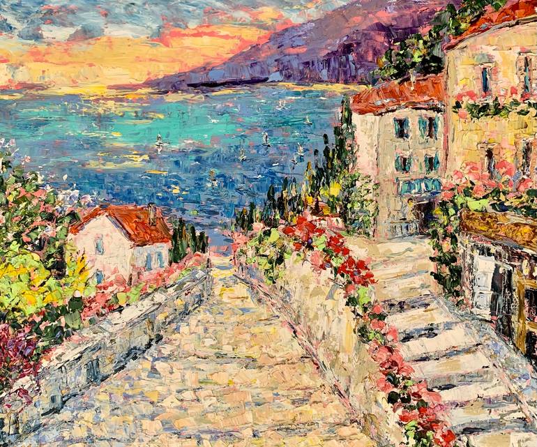 Italian Riviera Landscape Impasto Oil Painting On Canvas *Title: „Coastal town“ *Size: 23.6"x19.7" [60x50 cm] *Original handmade oil painting on canvas by brush and palette knife. *Made by me - Vilma Gataveckiene. This is not a copy or a print. *Signature on the front and on the back....