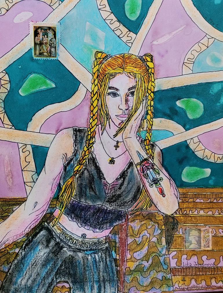 Portrait of a real person, young girl, that is showing all the joy of her age and an elegant and youthful style. With this painting, I wanted to express and give the viewer a feeling of joy every time he/she looks at the portrait. Ps: parts of the painting are filled with gold leaf