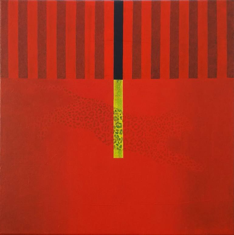 Geometric shapes in red, yellow and black overlap the image of the jaguar, which becomes just a watermark. An animal that flees amidst the fire in the charred forest. Original painting
