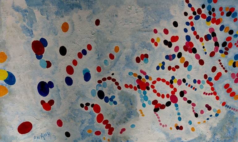 This artwork presents an intricate dance of vibrant dots against a textured blue backdrop. The canvas is alive with an array of colors—red, yellow, orange, blue, black—each dot varying in size, suggesting movement and rhythm. The composition appears both spontaneous and deliberate, as the dots form ...