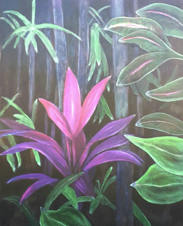 Peinture acrylique sur toile 80X100 cm / 32X39 in. Une merveilleuse fleur rose et mauve émerge des profondeurs de la jungle.