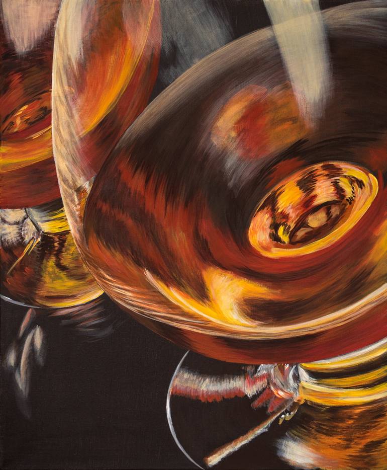 Amber shades and highlights of cognac in the glass. Nothing superfluous. Only refined taste and aroma for gourmets. At the end I use a coat of varnish, to protect the painting. Signed on the front and back and comes with a certificate of authenticity. Size: 60x50 cm (23.6x19.6 in) Sold unframed. Re...