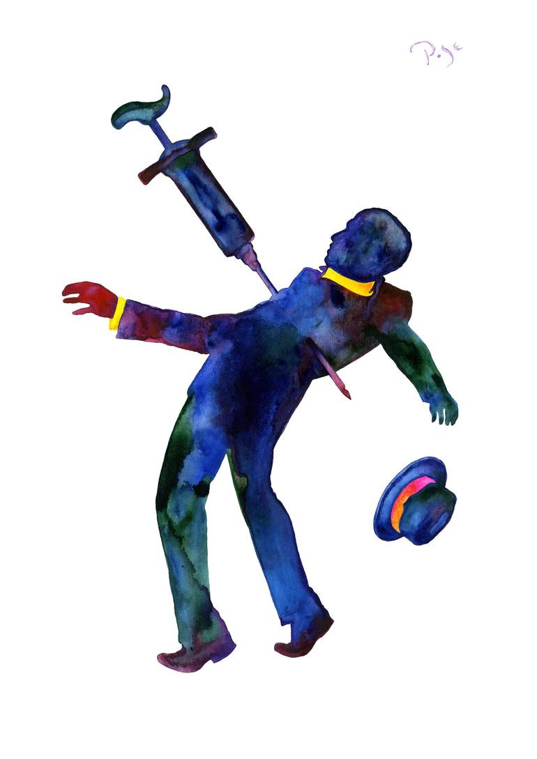 Watercolour, dedicated to the current situation in the world: corrupt governments and media, mass zombing by propaganda, compulsory jabs everywhere, states as drug pushers, fear as a lifestyle. Painted in Brussels on February 9, 2022.