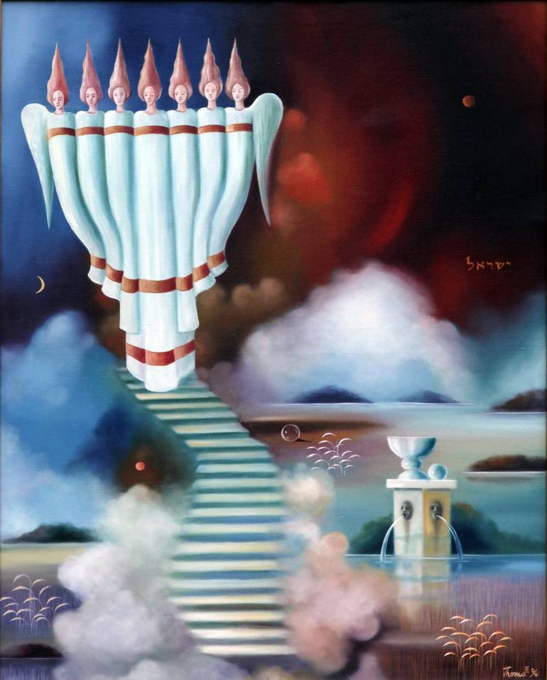 Thoma: Jacob's Dream,Oil on Canvas, 100 x 80 cm,1996, original, signed Thoma IV, 1996, lower right. Stairs, seven Angels, red planets, Israel in Hebrew, water, spheres, vessel !