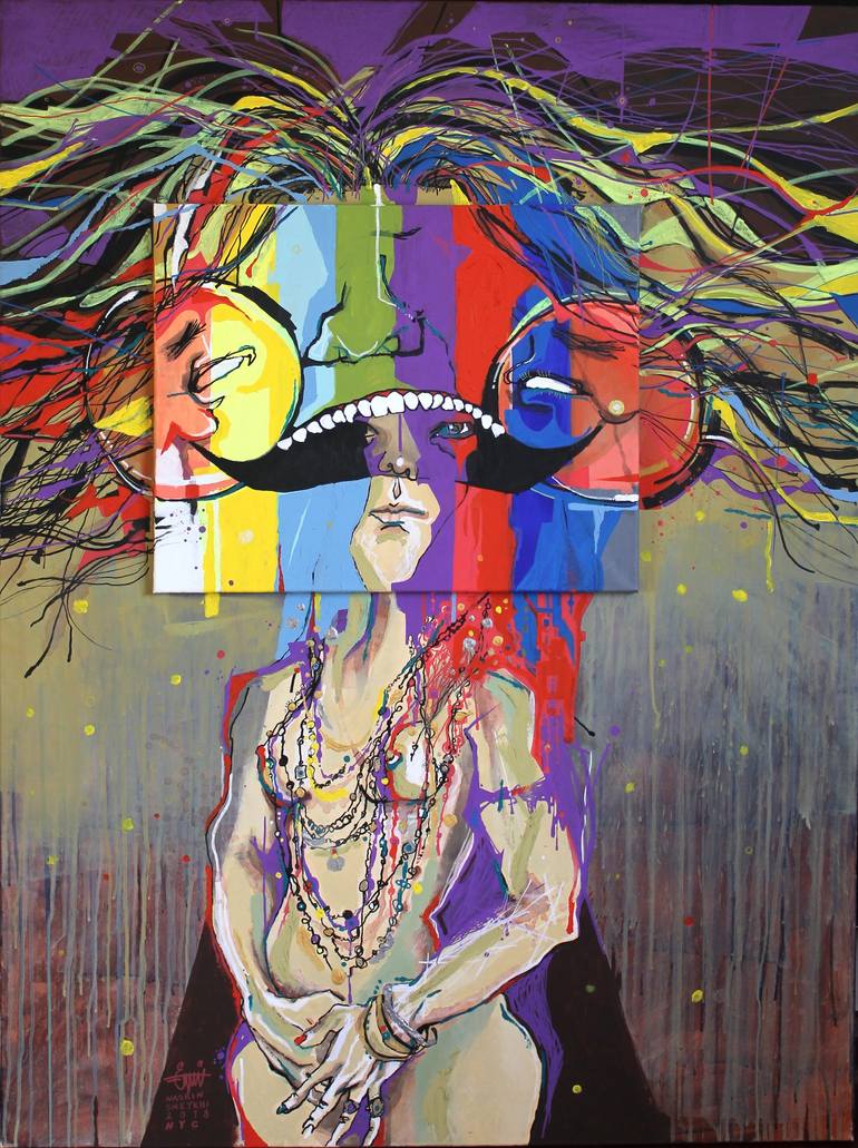 The globally recognized and acclaimed artist Nasrin Sheykhi, painter and Illustrator. Nasrin’s works do not fall into just one category. Painting, caricature, illustration; each work beckons the viewer to come closer to catch the references to politics, architecture, music, cinema, literature, psychology… the pieces are alive with movement and hidden meanings. Nasrin uses different materials, tools, and a singular understanding of artistic teachings to create each unique artwork. These elements come together in an artistic composition to make a culturally relevant collage laden with symbolism. Her determination and daring spirit have led Nasrin to publish two books, and she has been awarded over 40 international honors. She has created a new style of pop art depicting famous people including politicians, rock stars and other cultural icons. After her immigration to the United States, via an “extraordinary ability or genius visa”, Nasrin was featured in and on an impressive list of media platforms including a full page article in the New York Times. Below is a list of some of the media platforms that have featured Nasrin and her works: Huffington Post; WNYW FOX 5 TV News; Brur.America; France 24 News; Face the Truth Podcast- Ep.3; Art Talk podcast; IFA;