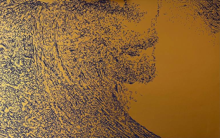 This extraordinary artwork reinterprets Hiroshige’s legendary “Great Wave” in a completely new way. The minimalist, calligraphic structure of dark blue lines on a radiant gold background gives the motif an elegant, almost meditative presence. The reduction to the essential highlights the pure essen...