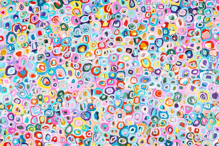 *ON EXHIBITION Until March 2026* READY TO HANG! Original painting on stretched canvas. Colorful and joyful abstract artwork painted in my "bubbles" style. A pattern of concentric circles and polka dots reminiscent of an aerial view of a field full of colorful flowers. Color palette: pink, blue,...