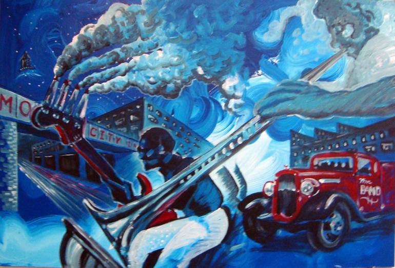 From the series "Working Class Jazz", "Jazz Factory" merges Detroit's industrial heritage with its rich musical legacy. This dynamic painting captures the rhythmic pulse of jazz music through bold blues and industrial imagery. Inspired by the city's transformation from manufacturing powerhouse to cu...