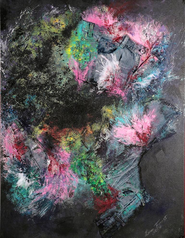 I feel very connected to the entire universe when I am in the process of painting.The energetic feeling of thrill and flow when reaching the state where there is no border between me and the painting. The gateway between the inside and outside world is open.Everything I express is all part of this cosmic, eternal dimension, avoiding egoistic obstacles. My soul is the melting pot where the ingredients of life brew.I pour that essence on the canvas . As a ballet dancer, I mainly use my body to express myself.These days I find my self being happiest if I paint, dance, write poetry, sing and make costumes etc. without limitations. I use acrylic paint on canvas, but just paint itself is never enough, so I mixed it with sand, seeds, cotton, denim and other fabrics, feathers, leaves, flowers, glitters, plastic etc.