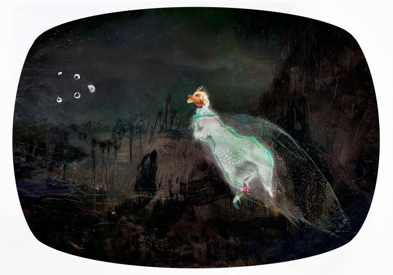 "Jenni, in spirit form, watches the first UFOs appear above the West MacDonnell Ranges." Lumachrome glass print, cliche-verre, chemigram, painting. Fox-killed Guinea Fowl, sticks, white-out, leaves, sand, crayon, eyeliner and salt on fibre paper. Exposed 47 hours in a geodesic dome. Unique edition o...