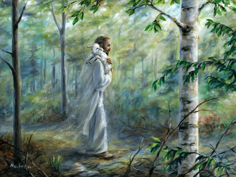 Jesus walks through a forest path carrying a little lamb. Maybe the lamb is you or a loved one - may this painting remind you that you are safe in Jesus' arms. The artwork has a unique spiritual/surreal look to it with the figure of Christ fading into the background. Original painting: - 24x18 inch...