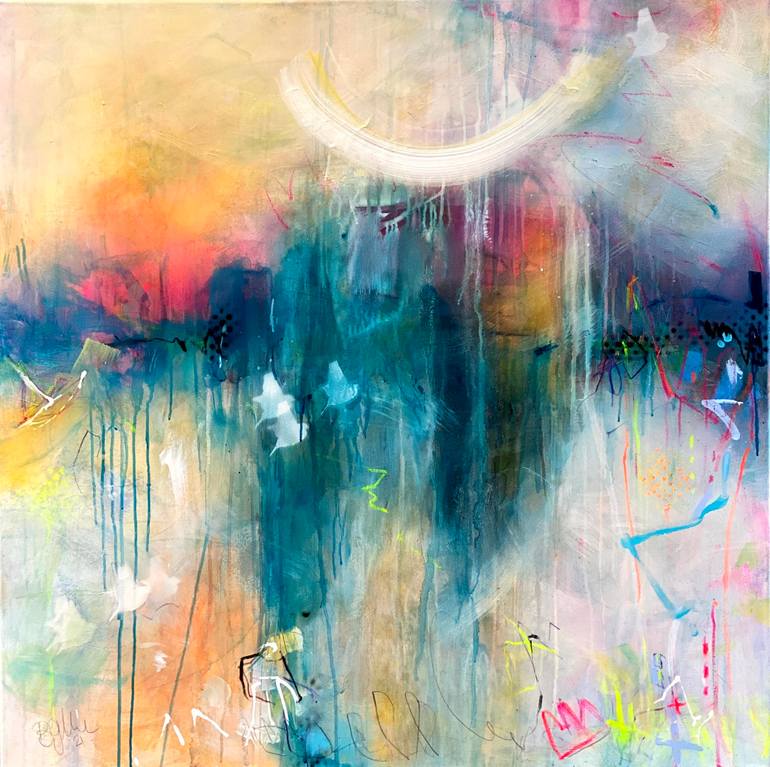 Acrylic, ink, neon color, Spray Paint, pastels, on Canvas. Joy and Happiness II is a 100 cm/39,4 in H x 100 cm/39,4 in, 3,8 cm/1,5 in deep mixed media painting. This new Series is called "Glückskinder" which means more than „Lucky/happy children”. “Glück” is not caused by coincidence,- it is a way t...