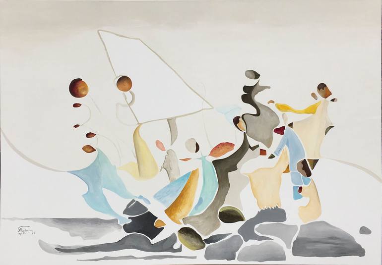 Joy depicts human figures with shadowed faces and billowing robes as they interact like a dance of light and darkness, separating and joining, intwining and embracing. Joy was a part of Ghada Embarek's fifth exhibition "Rendez-vous" which was held in 2021 at the Museum of Modern Egyptian Art.