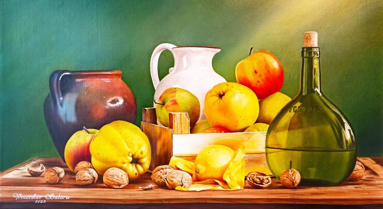 See this still life portrait painted in a realistic style. See how artificially I managed to convey to the canvas and the effect of transparency of glass and all the juiciness of fruits. This picture will bring light, warmth and certainly endless enjoyment.