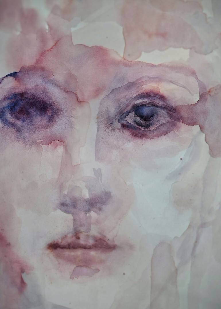 Portrait, face, figurative, watercolor, paper, fine art, woman, Pink, Violet, close up, eyes.
