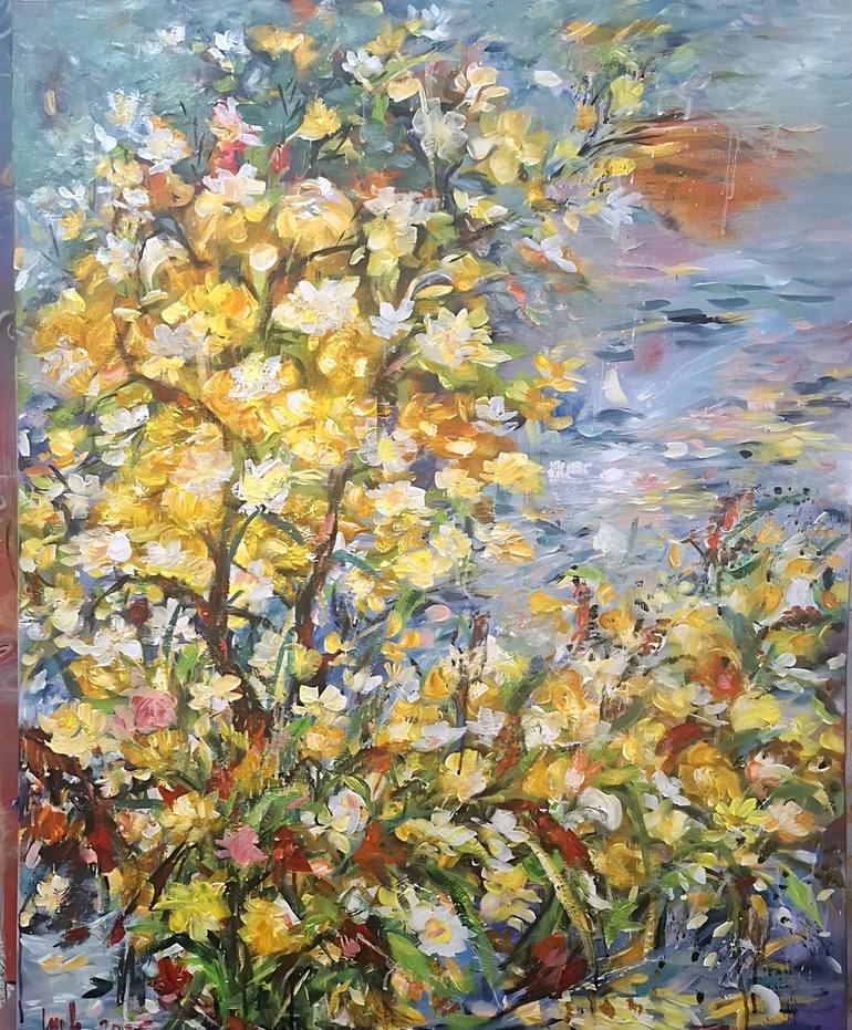 July Garden is a conceptual painting of a cheerful garden image with the reflection of sunlight, the calmness and tranquility of the lake, the changes of light, the swaying of water, the grass and trees, the yellow color scheme creates a feeling of prosperity and happiness,