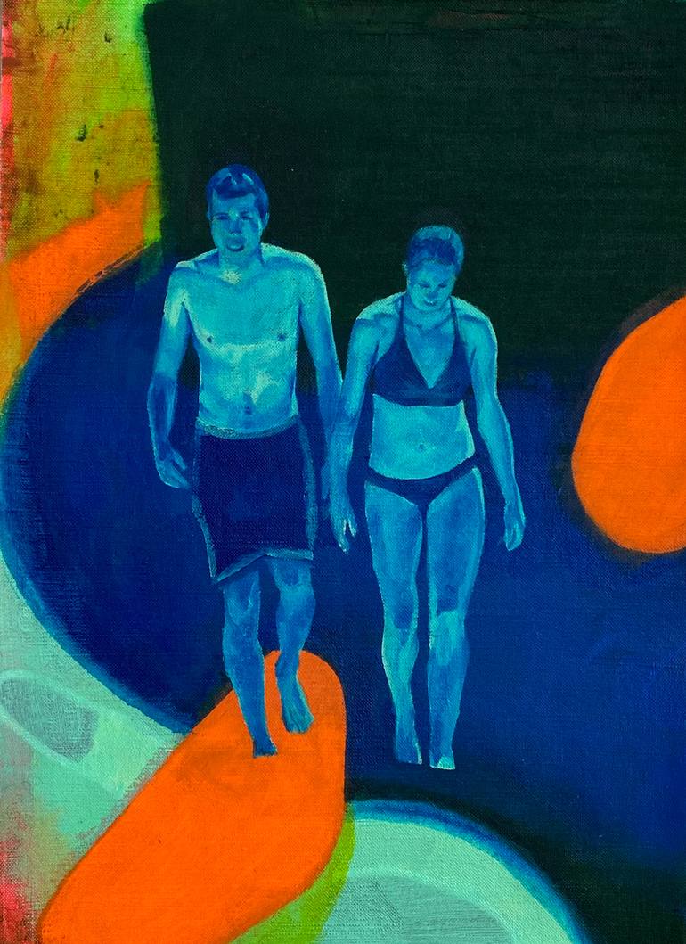 My artistic approach focuses on the representation of memories and recollections, mainly using paint on canvas and paper. I explore themes such as the passage of time and the effect of color on emotions. My style is characterized by its reality, its graphics, its vivid colors, its dreamlike, nostalgic and poetic aspect. My main source of inspiration comes from photos I take personally, from memories and vacations, but also from photos of unknown people I find on social networks. These moments in life are transposed onto canvas. Portraits, bathing scenes, solitude and memories of personal significance that have influenced my career are recurring themes in my work. By using social and cultural contexts in my work, I seek to convey the memory of my time, to leave a reminder of my daily life and that of unknown people.