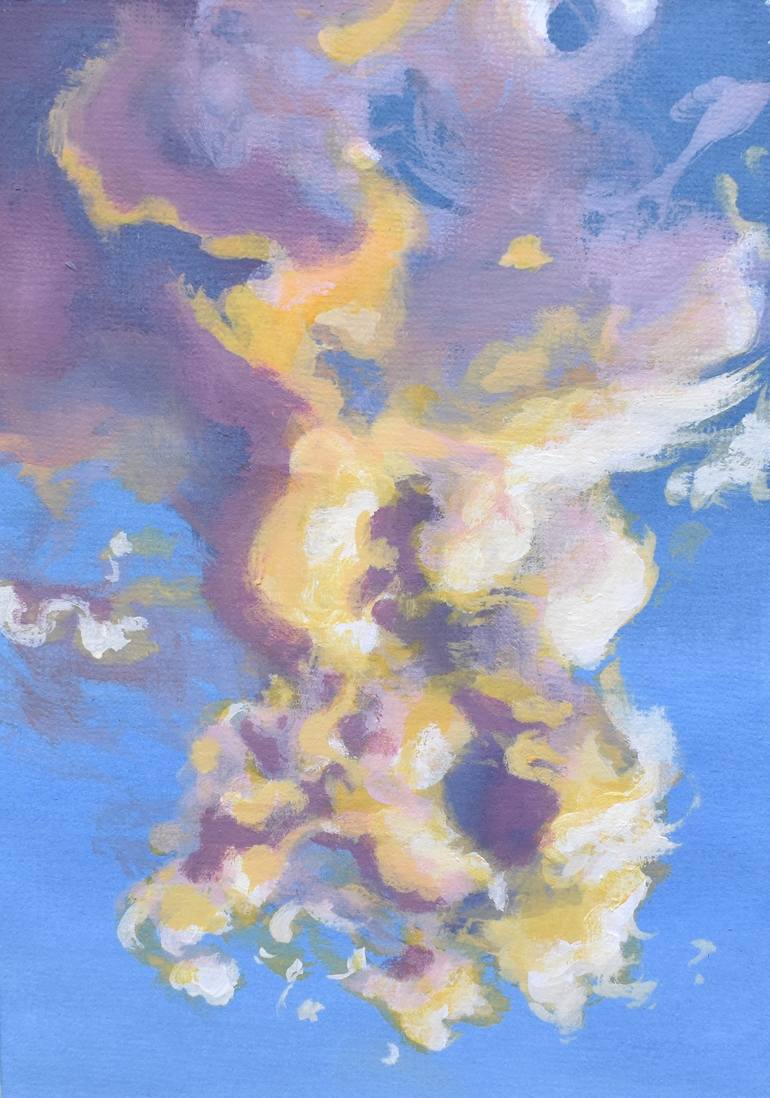 Clouds remind me of spirit or supernatural things. They are ever present yet intangible and elusive. These ethereal passengers go about their prescribed business with an indifferent certitude of design. A design that is often a mystery to us. This is a small painting so I’ve signed on the back.