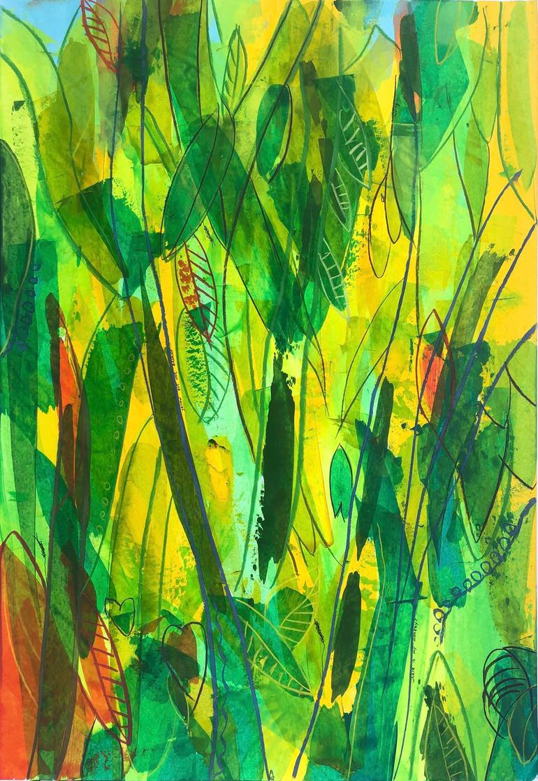 (yellow but not banana / hiding... / where is my monkey?) #4 from abstract botanical "Jungle" series. My “Jungle” series have vibrant colors and lots of secrets that are hidden behind the trees. Making many layers as usual, I place there some hints to such stories, so you can search for them and cr...