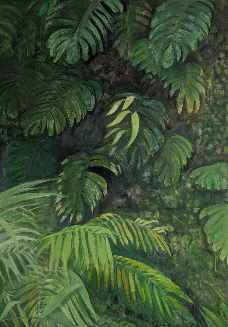 This larger painting is created from an image taken inside the greenhouse at the Madrid Botanical Gardens (Real Jardín Botánico). A real 'living wall' with a variety of tropical plants, I've recreated with oil paints, and oil pastels creating smaller textural details. Ready to hang on artist's woode...