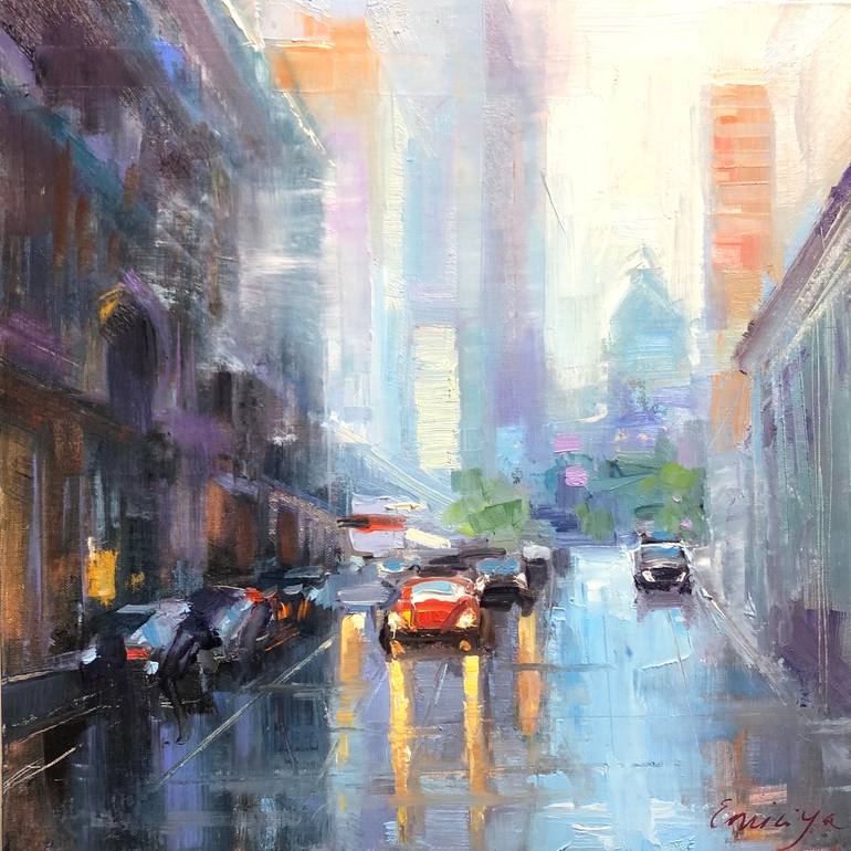 Rainy City 100% original, hand painted fine art, one-of-a-kind piece of Art by Emiliya Lane Size12x12 "Just After The Rain" Colorful Cityscape painting would be a great addition to your original oil paintings collection. This original piece of Art created on linen board . On the front side of th...