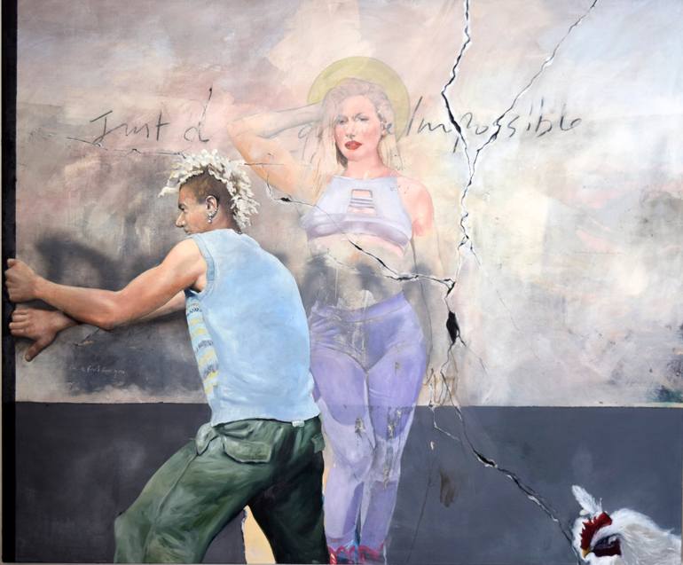 The painting started as a portrait of an ex Fine Art student who is now a professional wrestler. I struggled with the painting and the figure became sublimated into graffiti inspired by some I had seen in Rome which included a fragmented poster of the virgin Mary. While wondering what to do with the...