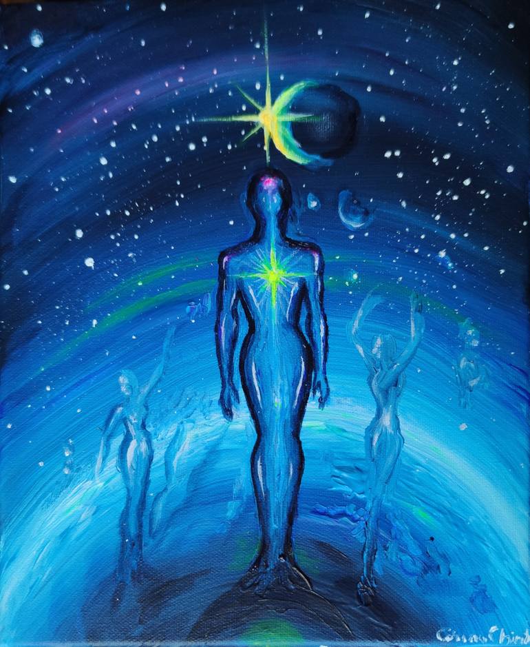 Just a human between the Earth and the sky, a painting about humans in the universe