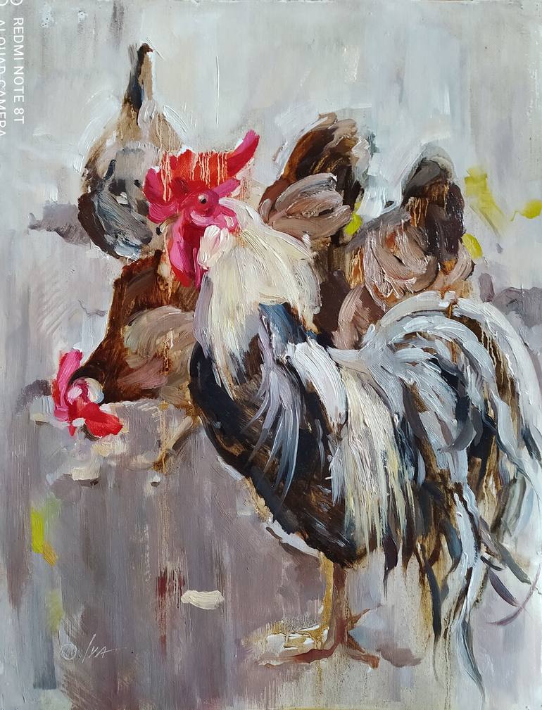 Деревенский щеголь. Просто куры. Когда я приезжаю в деревню, то вокруг вижу столько интересно. Меня вдохновляет буквально все, что я вижу. Это и травы, растения, деревья. Эти прекрасные куры, бегающие вокруг. Там сам воздух дает силы и желания жить. Хотелось написать кур, но так трудно их поймать д...