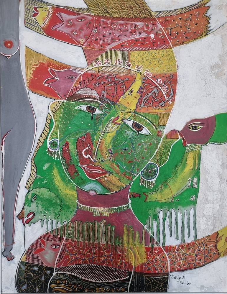 Ricky Lodewyk Karamoy (In Memoriam 1959- 2019) carved his journey on becoming one of Indonesia’s contemporary artists through the highlights of his artistic establishments in the 90s eras. Born in Bandar Lampung Province of South Sumatra in 1959, Ricky grew up in Yogyakarta where he developed a great interest in art, a beginning of a creative venture that later moved him to Ubud, Bali in the late 80s, a paradise turned a home of 40 years where he spent most of his time dwelling in philosophies of painting, mask carving and batik techniques, as well as learning from local senior art residents in Bali. Driven by the need to express, to visualize inner mood, as well as to break free from the institutional process of art making, Ricky then chose painting as a main language to speak up by, resulting in many series of playful, outspoken masterpieces. Ricky tells stories of his life mostly through contemporary paintings, in which most of his works tend to feature symbolic figures such as fish to epitomize life in the Universe and human character to illustrate the happenings, complemented by the application of cubical structures within the context of the paintings. His use of bold colors, wild structural strokes and objective symbols indicates his adaptation of both abstract expressionism and cubism. His paintings have been collected and featured by galleries in Indonesia, Australia and Europe. Aside from having led a number of art exhibitions and being involved in collaborations with art communities all around Indonesia and overseas, Ricky created Kuramaya Gallery and Tigaman Gallery in 1990, art spaces that ran for close to a decade located in Sanggingan, Ubud. Ricky then moved to Kuta in 1999 and engaged in one of Bali’s biggest artist communities ‘Bunga Bunga Bali’ based in Kuta Central Park at the time. Kuramaya Art remains to be his private studio in Denpasar. Instagram .art for further information.