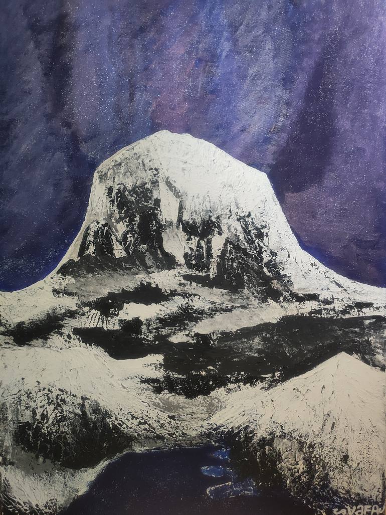 Experience the awe-inspiring majesty of "Kailash" a captivating landscape that invites you into a realm of serenity and wonder. This stunning painting features a towering, snow-capped mountain set against a deep indigo night sky, dotted with shimmering stars. The textured brushstrokes and palette-kn...