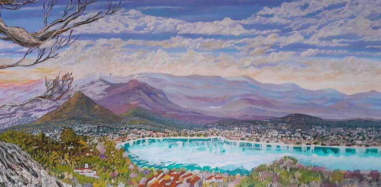 Standing on the cliff, the view was so beautiful…. the clouds were so close you could almost touch them. The mountains are covered by the morning mist… The lake was glistening for the morning sun. The colors used are bright yet mellow, it is a breathtaking view brought to life by the artist. 40653-...