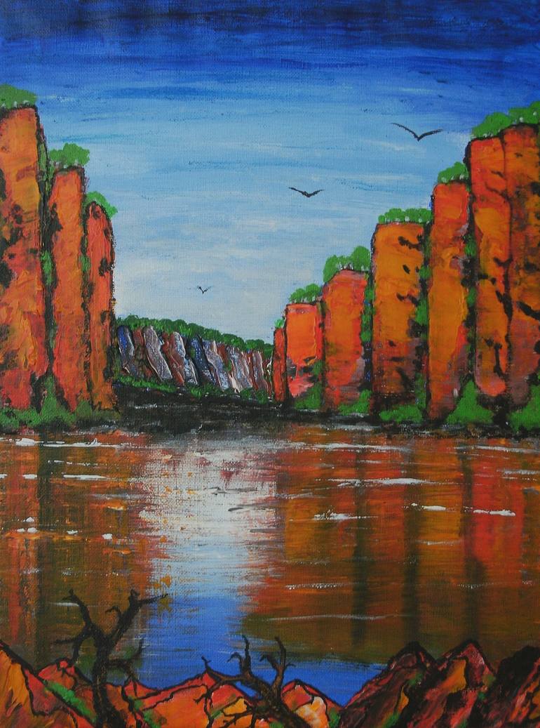 Acrylic paint on a box canvas painting depicting fruit bats flying over one of the gorges on the Katherine River within Nitmiluk National Park Northern Territory Australia