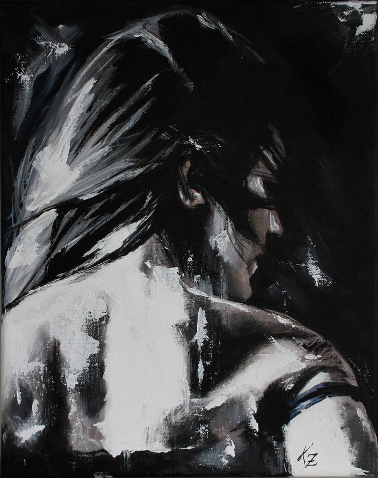 Although I paint primarily portraits, I do not consider myself to be a portrait artist. While traditionally a portrait artist would strive to capture the likeness and essence of the sitter, I am instead painting psychological concepts; traits that I admire, have within myself, or wish to cultivate. My works are not renderings of people, but rather character traits, and emotional substrates. My paintings are a way for me to contemplate human psychology. I have always been fascinated with the inner workings of the mind, and use faces as the most direct method to deliberate and convey various traits and strong characteristics, for example, determination, thoughtfulness, wisdom, or kindness. I’ve always felt that the eyes truly are the windows to the soul, therefore, I usually place a great deal of importance on the eyes, and most of my portraits are painted with direct eye contact aimed at the viewer. I work in acrylics on canvas, adding 24k gold leaf on occasion. I paint using only black, white, and the three primary colors. I decided on this very limited color palette because the use of minimal colors reduces distractions and keeps the focus on the features of the face. The majority of my paintings have black backgrounds for the same reason: to keep all the focus exclusively on the face, having these faces essentially exist in a void. I usually use stock photographs as references, but I create composite faces, so that most of the faces I am painting are not real in a conventional sense, but created specifically to bring out the specific characteristics I am aiming for in each work. Though quite often the characteristics shift and evolve during the painting process, to create something more than what was initially intended.