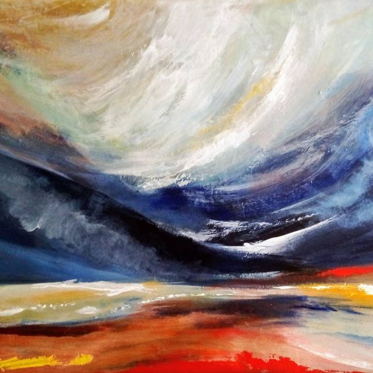 Artwork done in Acrylics on canvas sheet. With loose brushwork and palletknife. Meditative piece with splahes of red to bring attention to focal points and wake up the senses. Water is also a source of life and therefor an important part of my subjects. Water is healing and so are the skies ar...