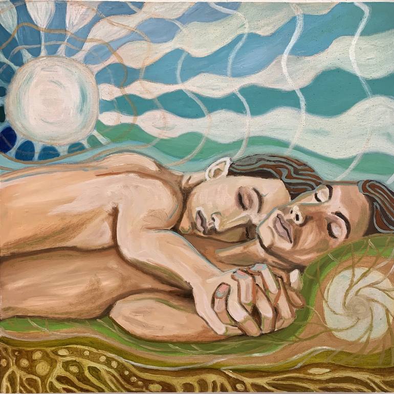Keep Holding On was painted in 2020 and is about two men holding on to each other and letting their bond create the world around them. The painting is on a cradled wooden panel, the sides are painted white. It is signed and title on the back and there is a wire so the piece is ready to hang!