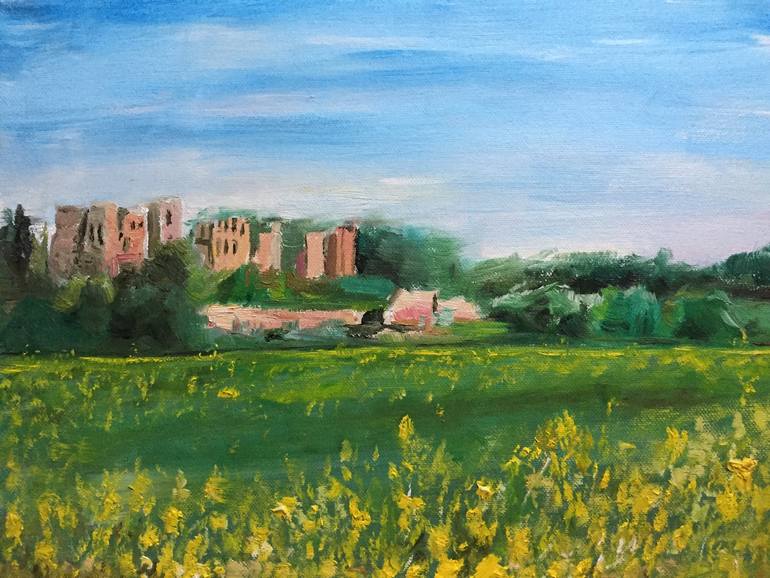 The combination of the yellow rapeseed field, green trees, blue sky and the sandstone castle ,create a very striking feeling. Together with the historic kenilworth castle had to painted . Tried to capture an image that could be of any time.