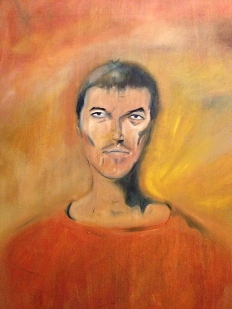 Large portrait of and tribute to Kenji Goto. Oil on wood panel.