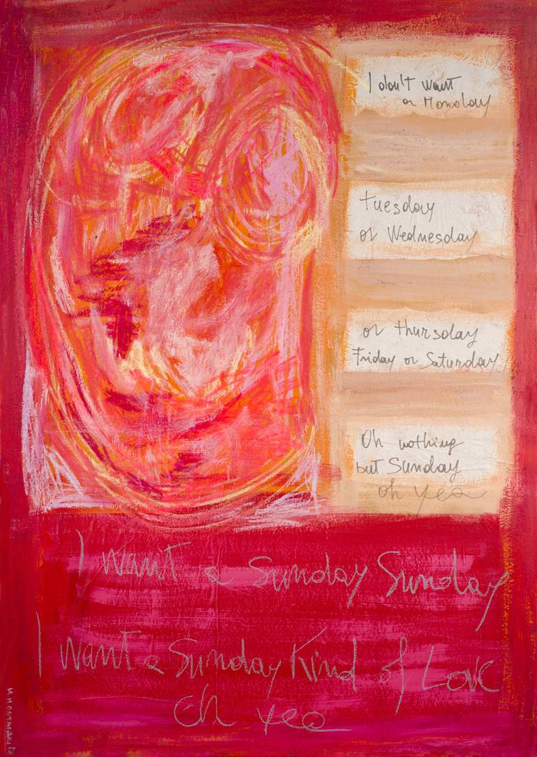 My inspiration was about a great blues song of Etta James -I want a Sunday Kind of Love- I like her sensual grim. I simply have represented my sensation for this song, through the powerful charge of colours. Nothing else except a few of refrain word. The colours are already so strong alone. Lyric ....