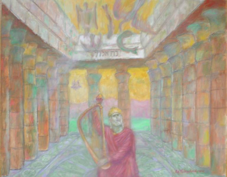 "King David playing lire".Inspired by The "King Solomon" Rhapsody by Composer Ernst Bloch. Oil on panel. Connecting Past through Present to The Future. "Eul 25" - Mystery Month of Creation of The World. Flying "Lost Towns" connected Past with The Future as Artist Signature. Flying Fishes in The Sky...