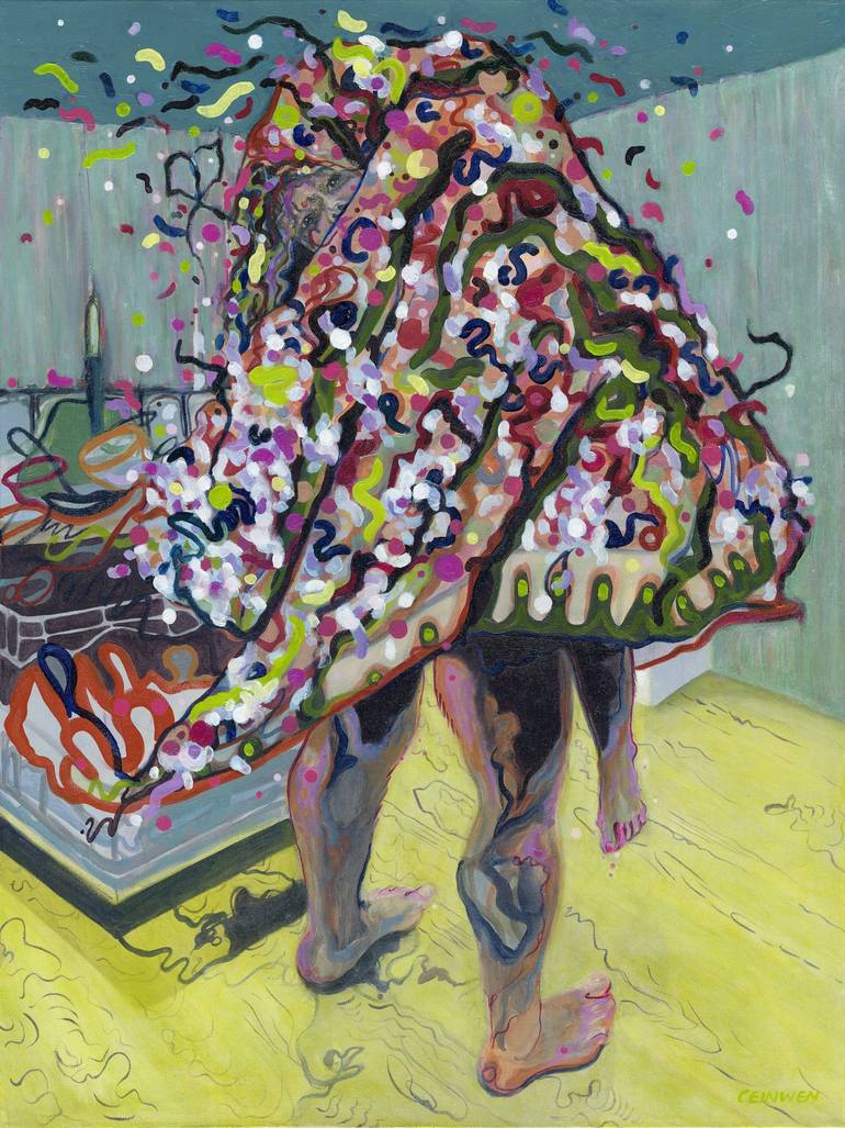 The image comes from a photo taken in my kitchen of my daughter and their step dad. I feel that the image expresses the juxtaposing energies that exist in the day-to-day. The mundane and the magical. The colours within the piece are fun and lively but also quite uncomfortable to be with- this piece...
