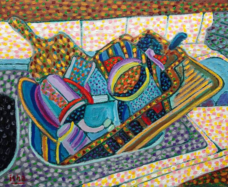 An Expressionist painting of my sink. I was in inspired by the fact that I did the dirty dishes and hadn't had another Acid flashback in ages. Lol. I played with the oil paint on canvas as as a young girl in my barrio screamed in the background. This original oil painting is 16 x 20 inches on 19 x 2...