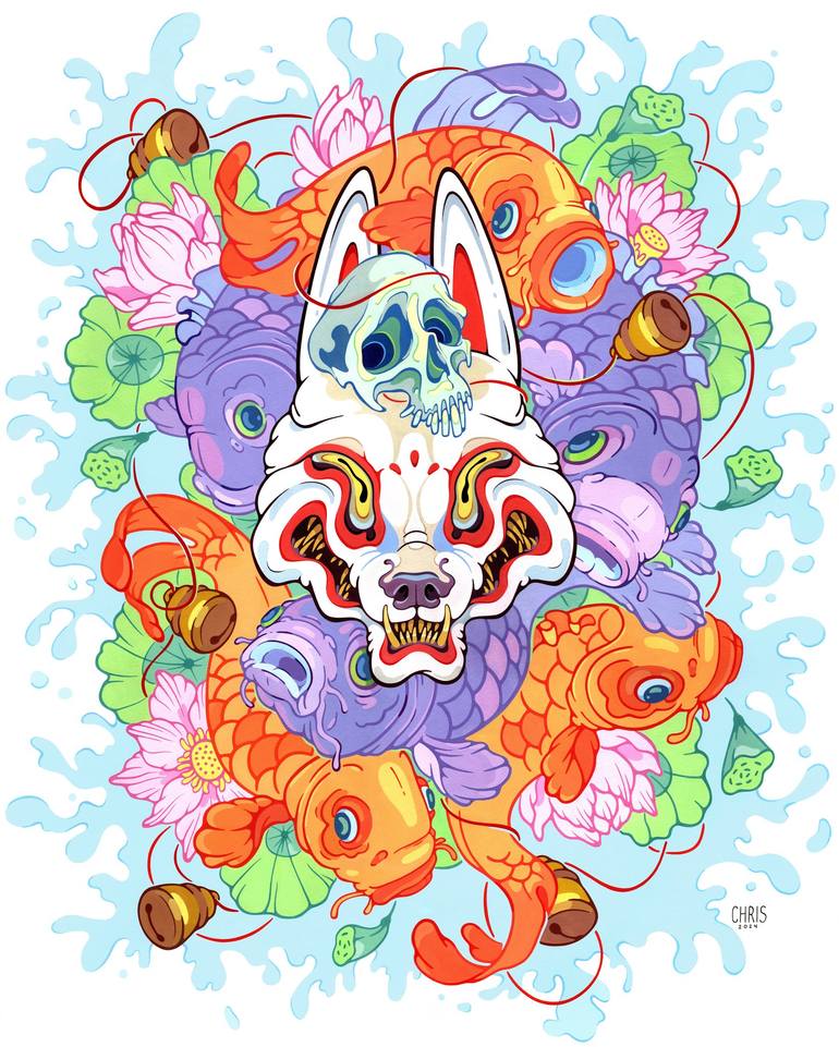 The inspiration for this work came from studying Japanese folklore and its profound symbols, particularly the Kitsune mask, representing a combination of cunning and intellect. The Kitsune and Koi fish are chosen as symbols for their profound significance in Japanese culture. The skull over its hea...