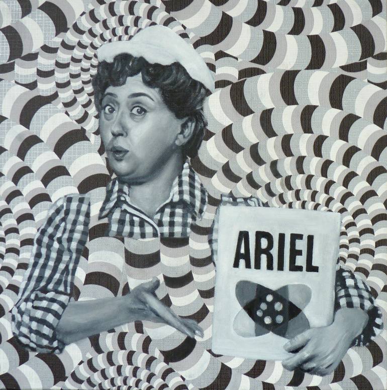 Original oil painting on vintage wallpaper mounted on stretched canvas. Karen with Miele 3 is painting number 27 of the series "Disappearing Housewives". In this series I paint women more or less disappearing in, or dissolving with the background/wallpaper while tending to housework. The series is d...