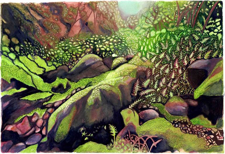 "Knitting Rocks" is a painting on paper which, is part of my series "Pagamentos". It depicts a place where I offered gifts to the spirits and the land, creating unity between different realms. Through these pilgrimages, I capture fleeting, sacred moments—the colors, the play of light and shadow, and...