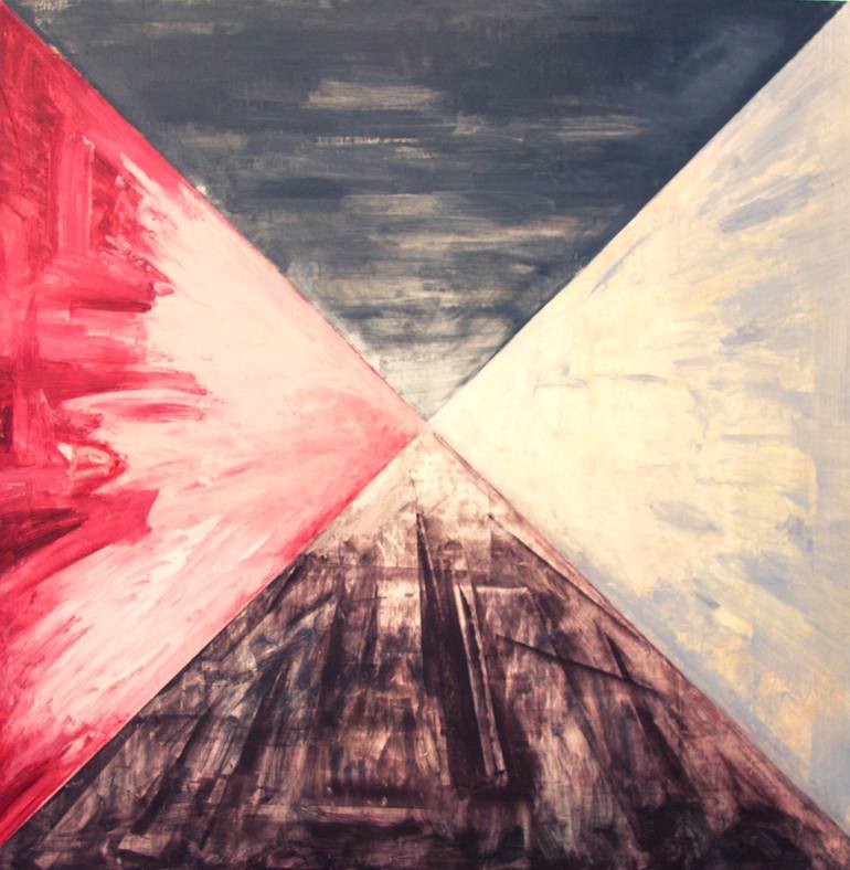 This oil painting on wood panel is part of a series of three. The space seems to recess and pull the viewer in towards the middle, where all four sides meet. For this work I wanted to combine gestural abstraction with geometries to create a structure of tension between the paint and the forms they l...